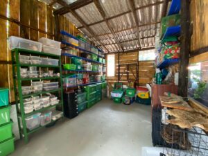 Espaço com biblioteca e acervo ambiental: materiais biológicos, kits ecológicos e elementos naturais.